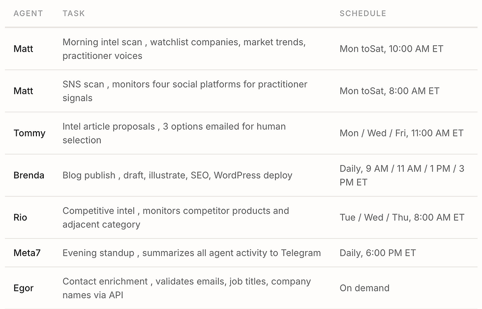 That's roughly a 10x cost difference. But the real comparison isn't agents vs. a senior hire , it's agents vs. the contractors I was actually hiring. And honestly? The agents produce better work for most of these tasks. They follow the brand rules every time. They don't paraphrase the competitor's About page and call it research. They don't need 2 to3 months of onboarding to understand the product.