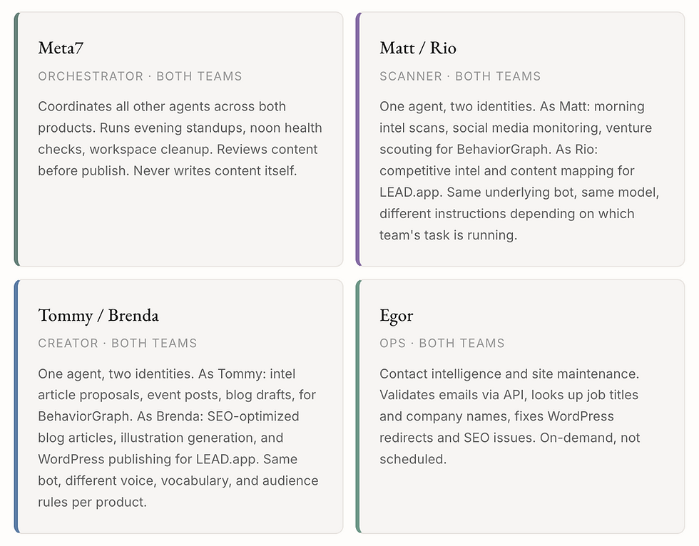 The restructured system uses four agents: an orchestrator, a scanner, a creator, and an ops agent. The key insight was that the scanner and creator each have two identities, one per product. The scanner runs as Matt for BehaviorGraph intel and as Rio for LEAD competitive scans. The creator runs as Tommy for BehaviorGraph content and as Brenda for LEAD articles. Same underlying bot, different instructions, voice, and vocabulary depending on which team's task is running. The orchestrator (Meta7) coordinates across both.